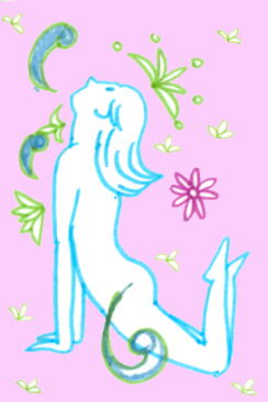 水を文様化したデザインをバックにヨガポーズ、マリーチアサナAをする女性を描いています。ちょっと涼しげな色使いをしてみました。いままでのイラストの女性とは違い、今回はセクシーな感じが出てます。(*^_^*);;ん~~~いいなあ(自画自賛)