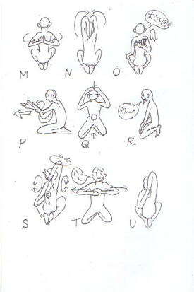 肩の固い方のための、ヨガ呼吸体操です。吐く息で強く動作しますが、リラックス~~これがコツ d(^-^)呼吸に動作を合わせた、呼吸体操としておこなってください。まず、肩を大きく前後に回してウォーミングアップしましょう。あとはイラストのAからLまでを試して下さい(*^_^*)A 手を組んで、掌を返し前に伸ばします。 伸ばしたとき息を吐き、吸って緩め、 角度を変えながら 吐いて前に伸ばし、吸って緩めを繰り返します。B 後ろに手を組み、吐いて下に伸ばし、吸って緩めを繰り返します。 伸ばしたとき掌どうしをくっつけ、肘を寄せ、肩を寄せるように~C 同じく後ろに手を組んで、吐く息で上に持ち上げ 吸う息で緩めるを繰り返します。D 前で片腕の肘を持ち、持った手の方向に引きます。 まず脇の下に手を入れ、息を吐きそっちに引き~ 吸って緩め。 次は肩の上に手を置き、 吐きながら引き~吸って緩め~ 最後に耳の横に手を置き、 吐きながら引き~ 吸って緩め~ これを左右、おこないます。E 上に腕を上げ曲げた肘を持ち、持った手の方に引きます。 吐いて引き~吸って緩め~を左右おこないます。F 腕を後ろに回転させながら 胸を開き~息を吸い~ 腕、肩を前に回しながら 胸をしぼめ~息を吐き~を繰り返します。G 後ろで手首を持ち、 持った手の方、横方向に吐く息で引きます。H 後ろで肘を持ち、 持った手の方、横方向に吐く息で引きます。 Gのストレッチを強くした形です。I 後ろに手をつき、吐く息で 体を前にスライドし肩甲骨を背骨から引き離します。 *以下J・K・Lは胸を開く呼吸体操です。J 腕を吐く息で引き、肩甲骨を寄せ胸を開きます。 最初は息を吐きながら腕を曲げ胸の横に引き、吸って緩め~ つぎは腕を息を吐きながら、上にあげて後ろに引き吸って緩めます。K 上に片腕を上げ曲げた肘を持ち、今度は側屈をし 吐く息で、わき腹と胸を横に広げ、吸って緩めます。L 上に腕を伸ばし息を吐きながら、斜め後ろに体を捻りながら 捻った側の胸を開きます。吸って体を戻し、吐いて反対方向に捻ります。Mind and body RefreshingYOGA NOTEBOOK肩のヨガ☆その1(肩の呼吸体操)