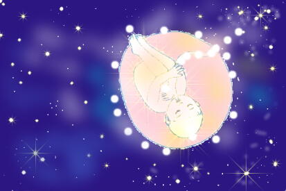 ヨガでは、宇宙の存在に対し、私たちの人体を”小宇宙”として、対応するものと考えます。いわば宇宙の縮図として人体を考えているのです。私のヨガの先生、龍村修先生にこう教わりました。 「物質を形作る小さな単位、 ”元素”は宇宙創生のとき出来たもので、 鉄の元素ひとつにも宇宙すべての情報が記憶されている。」 「私たちの細胞の一つ一つには、全生命進化の記憶がある。」 「お母さんの体内にいる十月十日の間に、生命27億年の進化を再現し 人間の形になる。 そして体内の赤ちゃんの一日は1000万年に相当する。」 「シャバアサナで体を投げ出していくと最後に残るものがある それは宇宙を見ている目!目だけになる。」 私たちがいま、ここにいるのは宇宙あってのもの生命の連続の積み重ねあってのものなのです。それでは、宇宙の中の自分自分の原点の宇宙になる瞑想を始めましょう。 楽な姿勢で座るか、寝転ぶかして、目をつぶります。まず、おへそを確認してください。へそは単なるおなかのくぼみでしょうか?いまは、使っていない部分ですが、私たちが、お母さんの胎内にいるときには、この”おへそ”とお母さんをつなぐ、へその緒というパイプを通し、酸素や栄養といった、命の維持と成長に必要なものを貰っていました。物質だけでなく愛情など気持ちの、交流も行なわれています。そのことを思い出してください。目をつぶるとそこは暗い、宇宙の空間です。そこに一人で浮かんでいます。でも孤独ではありません。宇宙という母の胎内にいるのですから。目が慣れると、星々がきらめているのに気づきます。いま、あなたは、おへそから宇宙のエネルギー”プラーナ”を貰っています。おなかを膨らまし、プラーナを吸いこみ、へこませ宇宙に返します。腹式呼吸で宇宙の母とつながりました。おへそは、やはり母とつながるところでした。おなかを膨らませ、おへそからエネルギーをもらうとき、暖かいものがおなかに流れ込んでくるイメージを繰り返して下さい。おなかに充ちた、プラーナの暖かいエネルギーが、おなかから、全身へと広がっていきます。そのプラーナが、心身を癒していきます。体、心の修復を図ってくれます。全身の細胞、心の働きたちが、癒され、新しいエネルギーをもらい生き生きと喜びだしました。喜びの光を放っています。心身が光る星々になったようです。今、宇宙の胎内で光る星が、あなたです。・・・・・・・・・・Mind and body RefreshingYOGA NOTEBOOK宇宙の☆赤ちゃんになる瞑想(改訂版)