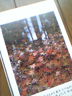 どうです?ステキなハガキでしょ?ちょっと携帯の画質が荒いのと適当に撮った写真なのでよさが伝わらなさそうなんですけど。先日オードリーさんとヴァユさん・アーサーさんカップルとお茶する機会がありまして、そこでこのハガキをいただいたのです。特にこの紅葉がお気に入りなんです♪写真を撮るときのお話も面白くて、やってみたくなっちゃいました。アーサーさんは普通のデジカメとかではなく、昔の何とか(名前を忘れた)を利用しているのでじっくりとられるとのこと。私は気長に待てないので、同じことはできなそうですがご夫婦で旅行に出かけたりって楽しくていいなあ、なんて思いました。最近うちも各地に出かけていて楽しい♪ゆっくり旅をしたいですねえ。