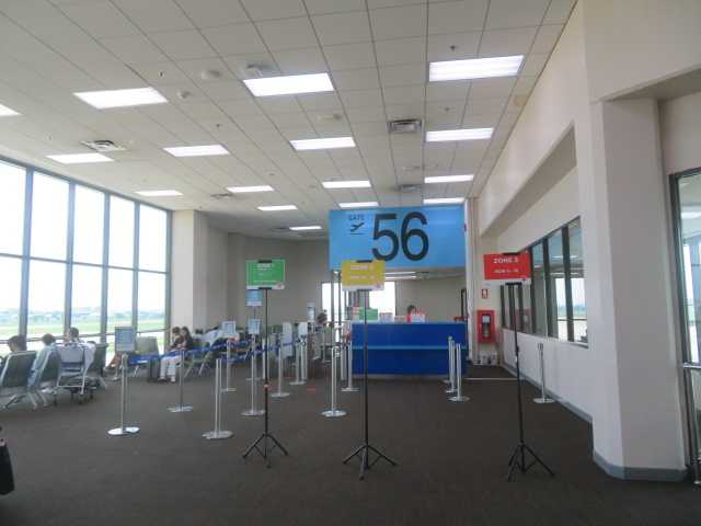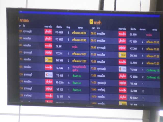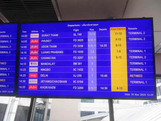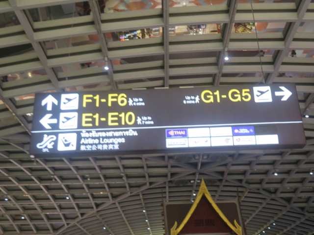ドンムアン空港駅からターミナルにやってきました。タイエアアジアFD3358。出発のところに14:35と表示されているのが搭乗機です。ディレイです。保安検査場に向かう前に4月のソンクラーンの休暇にベトナムに行こうと思い、エアアジアのホームページで予約はしたものの、座席指定ができなかったのでエアアジアのチケットカウンターでその手続きをしました。4月のベトナムからの座席指定も終わり保安検査場へ向かいます。保安検査場を通過してまずはゲートの確認。14:05発ウドンタニ―行FD3358は56番ゲート。30分のディレイです。ドンムアン空港内のレストランも充実しています。弁当べんとうはもうタイ語になっています。こちらはスパゲティファクトリー。ラーメンの一風堂もありますよ。シュークリームのビアードパパ。相変わらず人気のサブウェイ。いつも行列ができています。一番端にある50番台のゲートまではもうすぐ。ここを左に曲がると50番台のゲートです。曲がるとすぐに出発案内板。ゲートは51番から56番まであります。