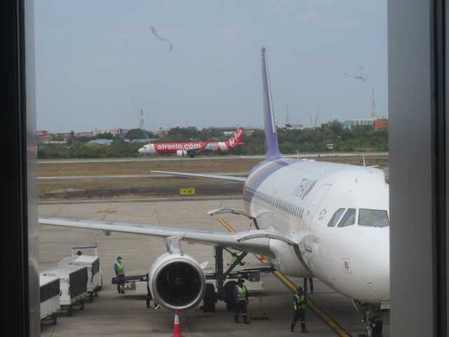 搭乗を待っているとエアアジア機が到着しました。間もなく搭乗案内があると思います。TG機005便。1番ゲートからの出発です。優先搭乗を利用させてもらいました。搭乗待合室にはこんな祭壇があります。この祭壇の前にソファーがあって僧侶の方専用ソファーになっています。貨物室に荷物が送られています。搭乗開始です。ボーディングブリッジから見えるのはお隣のターミナル。ドンムアンから飛んできたエアアジア機が駐機しています。やっぱりボーディングブリッジを使っていませんね。搭乗機の操縦席が見えます。搭乗して着席。機材はA320ー200。後方座席を事前に指定していましたが、カウンターで前方の座席に変更してくれました。出発の準備が整ったようです。