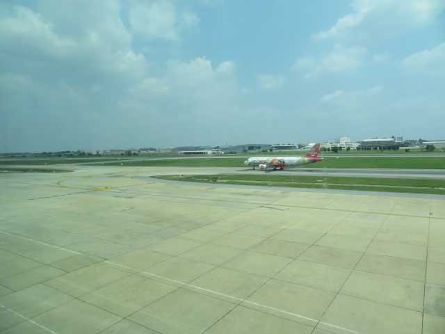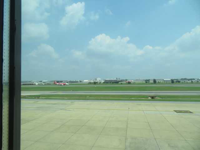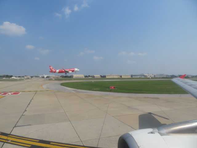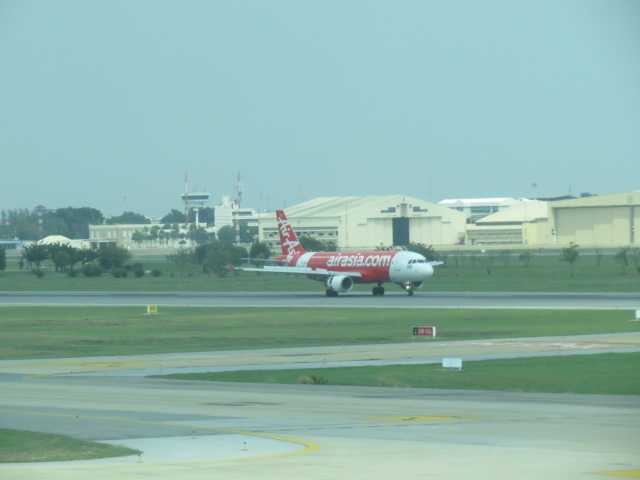 エアアジア機が着陸しました。そして反対側の滑走路からエアアジア機が離陸していきました。ゲートに入る様子を撮ろうと思いました。滑走路から誘導路へ。あぁ~56番ゲートに来るのではないようです。これではありませんでしたね。もう一機下りてきましたが・・・。これでしょうか?これまた違いました。そうこうしているうちにお隣のゲートからエアアジア機がトーイングカーにひかれていきました。トーイングカーが外されました。そしてノックエア機が離陸していきました。