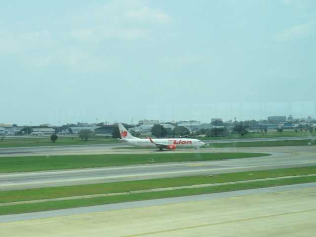 エアアジア機が下りてきました。きっとこれだと思うのですが・・・。駐機スポットに向かうエアアジア機の後ろには離陸していくバティックエア機。搭乗機のようです。遠くの駐機スポットにはプライベートジェットがいました。56番スポットにマーシャラーさんがやってきました。搭乗機がやってきました。マーシャラーさんが誘導します。右に曲がるよう指示をしています。搭乗機がスポットに向かってきます。黄色のラインに向かってきます。このまま直進の合図です。両方のマーシャㇽが上がります。そして停止の合図。搭乗機が駐機スポットに入り停止しました。