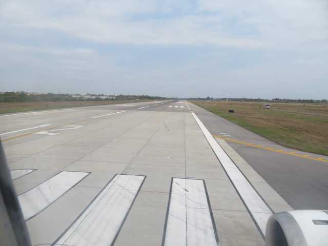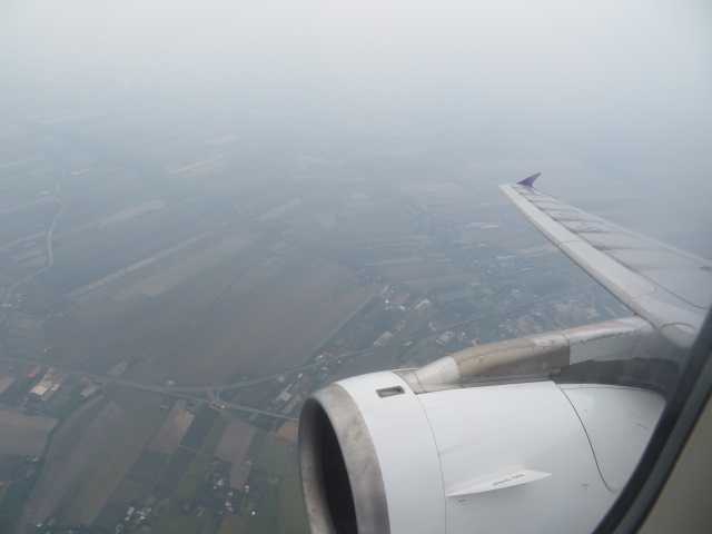 眼下には高速道路のジャンクションが見えます。長方形の畑が広がっています。搭乗機は北上を続けます。上空に広がる白い雲。コラート台地は霞んでいます。搭乗機は着陸態勢に入りました。いつもの風景とはちょっと違うような。この日は西側からの進入のようです。いつもと違う風景が新鮮です。新興住宅地が見えてきました。216号の環状道路上空を通過。左側の座席A席からだとアパート方面を見ることができたのですが。右手にターミナルを見ての着陸です。