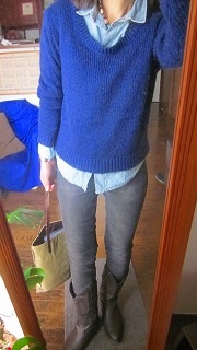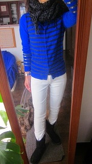 ユニクロさまさま。何本か持っている白パンツはほとんどユニクロで、さらにセール時に買います。 青&黒は大好きな組み合わせですが、黒の分量が多いと地味で冴えなくなってしまう!(私の場合)そんなときは白パンツ投入。他の色合いでイマイチな~ときも同様。かなり解決します。膨張色だ、なんて尻込みせずにいきましょう。困ったときの白パンツ。ブーツとぐるぐるマフラーでバランスを取った、つもりです。 今日のコーディネートは? ユニクロだよ! コメントをくださるなら別館「アイコ掲示板」 または「おきてがみ」でも 5月の舞台が終わるまでブログを簡素化します。 具体的には、1つの日記にあれもこれも詰め込まない、ってことでしょうか。