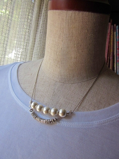 ちょっこっと手作りです。直径10mmコットンパール5粒を既存のネックレスに取り付けただけ。 ネックレスは娘がナニヤラ言う時計ブランドの福袋内に入っていた、という不要の物でした。3連チェーンにじゃらっと小さな輪っか(天然石ブレスの間によく挟まれているタイプ)がたくさん通されていて2連分はすでに「手作り素材」として取り外してありました。こんな白いブラウスにも使えるかな? 15年物自作ブラウスです。後ろが大きなボタンで全開するキチント系ブラウスで全く出番はなくても丁寧に作った物なので処分ができません。 袖が外に広がっているのが敬遠ポイントだったけれど、今季はこんなのも出ていますよね。それで着てみた次第。でもこれは全体に白っぽくし過ぎてアカンわ。パンツを替えるか靴を黒かにすればいいかしら。新しい物に次々と目が行くだけじゃないぞ!と自分自身に言い訳しています 手作りアクセサリー大好き☆ *オシャレ大好き*ソーイング大好き* クリックが更新の励みになります。いつもありがとうございます。 コメントをくださるなら別館「アイコ掲示板」