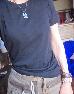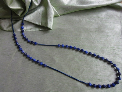 ソーダライトというネイビーの石でロングネックレスを作りました。 すでに「手作りロングを二重にしてみる」と7/20のブログに載せた物ですが、今日は手作り記録ですこちらは石を買った一年前の8月に描いたデザイン画。手持ちの小粒へマタイトやオニキスなども使ってみるつもりでした。 でもどうもいまいちパッとせず時間もなくなり放置していました。希望としてはこの石だけでシンプルにしたかったけれど、お金もかかるし(これだけで1700円)何より重い!材料の種類も色合いも抑えよう!と探し、色味が一番近かったマットなネイビーのチェコガラスを使うことに。 シルバーが入っていないので、そこそこシンプルに使えるかと思います。 そして実際にコーデ。「ネイビーのトップスに溶け込ませたかった」のは成功したかも、ですが全体的に暑苦しく、ボツにしそうでした(2週間ほど前の画像)が、反省点とともに載せることにします。ネックレスがシンプルなのはヨシとします。ネイビー上下もワザとです。パンツがベージュじゃ当たり前。靴ですね。これがモッタリと暑苦しい色とデザインかもしれません。コーデって難しいね。 手作りアクセサリー大好き☆ 今日のコーディネートは? クリックが更新の励みになります。いつもありがとうございます。 コメントをくださるなら別館「アイコ掲示板」