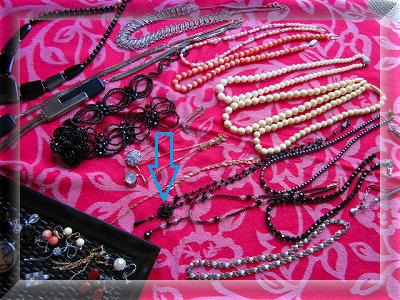 ネックレスを簡単リメイクしました。実家母からもらってきたアクセサリーたち。これらを材料と考えたのが、アクセサリーつくりを始めたきっかけです。 今回は青い矢印、オニキスネックレスのペンダント部分を使いました。 手芸用品売り場のワゴンセールで90cm400円ほどで売られていた黒いチェーン。芯はプラスチックなのかしら、とても軽くて表面はシルキーな布です。トップが真下ではなく、ちょっと横にくるように後ろに重りも付けました。(ちなみに右の画像はペンダント部分を取ったネックレスです) このようになるようにね。ところが後ろの重りが軽すぎてうまくこのあたりに収まりません。何かで重さを増やします。 手作りアクセサリー大好き☆ 今日のコーディネートは? クリックが更新の励みになります。いつもありがとうございます。 コメントをくださるなら別館「アイコ掲示板」