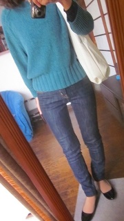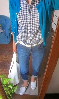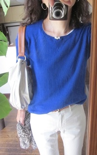 若いころからキレイな色合いのものを身に着けるのが苦手だったのでこうなった今も(どうなった?)明るい色目のものを着るときは気合いがいります。黄色、赤、ピンクなどのカーディガンなど持っているのに、着たくても躊躇してしまう。そんな中、この青!だけは大丈夫。 バナナリパブリック・アウトレットで買った薄手綿ニットですが、これ以外にもほぼ同じ色合いの七分袖Tシャツや綿ニットなどがあります。 このコーデのポイントは、バッグの持ち手に合わせたベルトの色です。ささやかにこだわっていますさて、リフォーム始まって一週間。大工さん、電気屋さん、水道屋さん、ガス屋さん、内装屋さん、、大勢の方が出入りし、日々、細かい打ち合わせがあります。キッチンがほぼ終わり、お弁当生活も終わりかな。 今日のコーディネートは? もっと心地いい暮らしがしたい! クリックが更新の励みになります。いつもありがとうございます。 コメントをくださるなら別館「アイコ掲示板」
