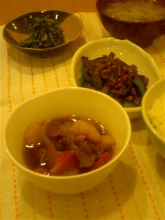 ヨシダソースって知ってますか?アメリカで大ブレイクした、日本人が作ったソース。私は友達に教えてもらって、よく使うんです。そう、手抜き料理の定番で(^^ゞ定番は、チキンに30分ほどつけて焼くだけのいわゆる照り焼きチキンなんだけど、これが本当においしい~(^^)息子の英会話教室のクリスマスパーティーが、一人一品の持ち寄りで、これを持っていったところ・・・美人外人女性教師(23歳、アメリカ人)に今日のNo1料理だとお墨付きをいただいちゃいました(*^。^*)アメリカで人気のでた味なんだから、あたりまえといえばあたりまえなんだけどね(^^ゞ外人にも認められて、ちょっと嬉しくなっちゃいました♪そして、私はこれを肉じゃがにも使うんです。今まで自分の作った肉じゃがに、もう一味ほしいな~と不満をもってたんだけど、これを使うようになってから、味が決まる!決まる!パパも納得のお味♪おいしいんです(^^)きっと香辛料がいろいろはいってるからなんでしょうね。定番おふくろの味として人気の肉じゃがも、我が家ではあまり出番はなかったんだけど、これを使うようになってからは、よく作るようになりました(^^♪味付けは、このヨシダソースと醤油のみ。簡単です!(簡単大好き)あ、でも、ちょっと甘めで関東の味かも。いわゆる甘辛な味に香辛料が入った味です。そして、2日目より初日のほうがおいしい。2日目は味がしみこみすぎて、じゃがいもの味がしません(TT)今日は、その肉じゃがと、なすとピーマンとひき肉の炒め物。そして、ご飯、味噌汁、ほうれん草の胡麻和えと和食でまとめてみました(^^)