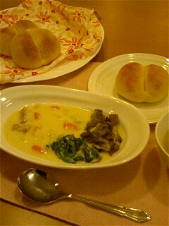 今日は、昼間焼いたとクリームシチューにしましたまいたけは、色が変わりそうなので、ソテーして別に添えましたそして、またまた昨日近所のおじさんに頂いたほうれん草もトッピングおいしくて、パパの分のパンがなくなりそうな勢いでしたあと、とチーズがあれば完璧なんだけどな