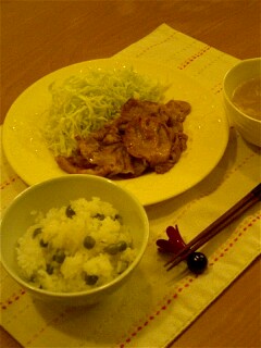 先日、ふらんすキャラメルさんのブログで青豆ご飯が載っていて、とってもおいしそうだったので、真似して作ってみましたふらんすキャラメルさんの食卓にはほど遠いんですけどねレシピは栗原はるみさんの「もう一度ごちそうさまがききたくて」お米2合に、お酒大さじ1、塩小さじ1いれるだけ。簡単でおいしかったです栗原はるみさんは、いつもこれに豚のしょうが焼きとポテトサラダの組み合わせだそうです。今日はジャガイモがなかったので、豚のしょうが焼きだけ真似して、あとはふかひれ卵スープにしました
