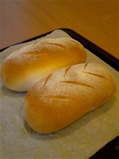 今日は約1ヶ月ぶりのパン教室でした今日焼いたのは、あの 白パン待ってたよ~今日の日を今日の生徒は4人。平日ということもあって、子連れのママが一人と、そのおばあちゃん。そして、仕事をやめたばかりで時間をもてあましているという方。あと、私(子連れ)でした。前回の教室に比べて、かなりなごやかムードスピードもついていけないと感じることもなく、やはり平日の方がいいかもそして、生徒の一人であるおばあちゃんが、保母さんのようにうちの子の面倒も見てくれて申し訳ないと思いつつ、とても助かりましたそして、白パンですが、焼きあがりこんな感じ白パン???ちょっと茶色いよね?それもムラにとは思ったけど、まあそれもご愛嬌食べると、ふわふわ、もちもち、おいしかったです~~白パンは、白く焼かなくちゃいけないから、温度管理が一番難しいみたい。生焼けでもいけないし、焦げてもいけないし・・・今日はガスオーブンで焼いたから、家の電気オーブンのほうが火力が弱いから色がつきにくいかも、とのことでした。それを考えると、パン屋さんの白パンって、いつも同じように真っ白でちゃんと焼けてて、すごいな~って感心しちゃいますそれから白く焼き上げるために、仕上げには上新粉を振りかけてから焼きます。強力粉では、色がつきやすいそうで、上新粉は白く焼き上げるそうですよそして、いつも自宅でつくるときに、なかなかできない捏ね上がり状態先生に聞いてみたところ、どうやら私は捏ね過ぎてるらしい今日も、ちょっと捏ね過ぎてましたグルテンがブチッと切れてしまう状態。先生が上手に直してくれたけど・・・もし、捏ね過ぎても、さらに捏ねればいいらしいんだけど、その場合は「押してひく」という捏ねかたをしなくてはいけないみたい。とにかく私は、捏ね過ぎるくせがあるようなので、あまり捏ねないように注意しなくちゃそれから、今日のもう一品。発酵の合間に焼いたモカケーキこれが、またまた最高においしかったですまるでお店で焼いたみたい!!生地がきめ細かで、ふわふわなんです自分でつくるときとの違いは、1.卵をといてグラニュー糖を入れて混ぜるときに、湯煎にかけるグラニュー糖を完全にとかすため。私、いつも砂糖がちょっとざらついて残ってたけど、しょうがないのかと思ってあきらめて、そのまま作業をすすめてたわ2.ハンドミキサーで卵をクリーム状になるまであわ立てた後、 泡だて器に残った生地を絶対にバンバンと振り落としてはいけない いつも思いっきりバンバン、生地振り落としてました3.溶かしバターは温かいものを入れる いったん溶かしたけど、さめてしまったものをいれてたよ4.切るように混ぜるというのは、ゴムベラをたてに入れて(絶対にななめにしない!)ボールをまわすようにして、均一に混ぜる ボールをまわすなんて、目からうろこたしかにそのほうが均一に混ざるたったこれだけの違いなのに、こんなにキメの整ったケーキになるなんてぜひ、スポンジケーキでも試してみたいわやっぱりちょっとしたコツで大きな違いがでるのよね。みなさんも、ぜひ参考にしてね♪