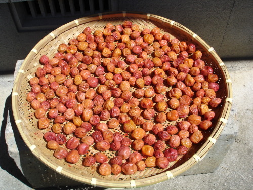 ぴかぴかのお天気が続いた(暑かったですね~!)ので、梅さんたちの土用干しを始めました。三日三晩、戸外に干します。まず三日間、10時から2時くらいまでお日様に干します。そして次の三日間は、夜に干して、夜露にあてます。その間、雨に当てないように注意します。現在、三日と一晩干しました。けれど、ここ数日大気の状態が不安定で、雷なんかがゴロゴロいっているので、夜に干すのを中断しています。それにしても、梅干しってやっぱり、手間がかかるんですねえ。毎回毎回、干すときに一つ一つざるに広げ、取り込んだらまた一つ一つ梅酢に戻す。なかなか根気のいる作業です。でも、郵便屋さんが干してある梅干しを見て、「梅干しがきれいですね~」と言ってくれて、なんだか鼻がピノキオになってしまいましたヨ。人気ブログランキングクリックで応援お願いします♪