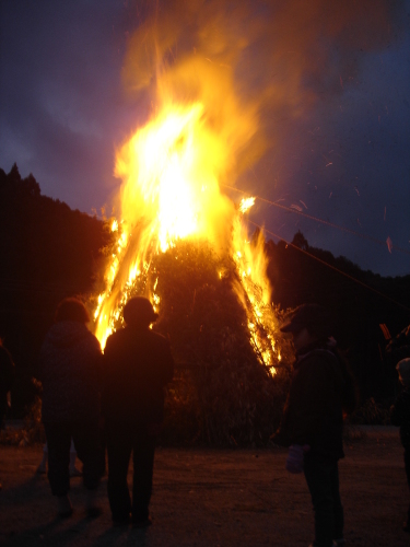 1月8日(日)に予定されていた、集落の鬼火焚き。雨のため、9日(月)成人の日に行われました。でも、前日からの雨で鬼火小屋がぐっしょり濡れていたため、なかなか火がつかず、ようやく燃え始めた頃には、すでに明るくなっていました。まだ暗い中、ゴーッと燃え上がるのが、鬼火焚きの醍醐味のような気がしていた私は、ちょっと残念でしたよ。 これは昨年の写真。夜明け前、燃え上がる鬼火小屋。火がつかない、と言えば、このところのお風呂沸かしも大変でした雨で薪が湿っていると(もちろん屋根の下に薪を置いているんですけど)、なかなか火がつかないんですぅ。新聞に杉の葉っぱや木くずを包んで置いてから、その上に段ボールの切れ端を散らします。そしてまたその上に、木の皮とか小枝なんかを置いてから、比較的細い薪、そしてだんだん太い薪を置いていきます。(これ、正解なのかわかりませんけど)そうしておいてから、新聞にマッチで火をつけます。だけど、雨続きで、空気も薪も湿っているときには、燃えやすい下の方だけさっさと燃えてしまって、肝心の薪に火がつかない。薪に火がつかないまま、段ボールや小枝たちが燃え尽きてしまったときの悲しさったらないです。何とか点いてほしくてうちわで扇ぎまくった努力もむなしく、炎が消えてしまうと、泣きたくなります。泣きたくて、もうやだー!と叫びたくなるけど、あきらめない。もう一度新聞や段ボールからトライする。私たち、こうやって強くなっていくような気がします。都会にいれば(いや、田舎でもたいていは)、ボタンひとつでお風呂が沸いてしまう昨今。私は、こうやってあきらめない心を鍛えているような気がします。正直言うと、もうちょっと、お風呂沸かし、上手になりたいんですけどね…。 大事な大事な風呂釜さん。人気ブログランキングクリックで応援お願いします♪