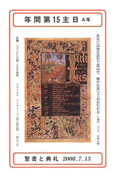 2008年7月6日 年間第14主日疲れた者、重荷を負う者は、だれでもわたしのもとに来なさい(マタイ11・28より)祝福するキリスト フランス シャルトル大聖堂(南側入口中央) 1217年頃ゴシック時代の典型的大聖堂の一つ、シャルトル大聖堂南側入口中央のキリスト像。左手に “生命の書” を抱え、右手では祝福を与えるしぐさ。フランス語で “美しい神”(Beau Dieu) と呼ばれる種類のキリスト像である。みことばが人となった方としてのイエス・キリストは、神の完全な美を備えているという理解を反映したものである。同時代の大聖堂扉にしばしばみられる(図a参照。扉・門に関してはヨハネ10・9を参照) 。図aでも同様だが、このシャルトルの像では、イエスの右足の下に押さえつけられているライオンが目立つ。見えにくいが左足の下に踏まれているのは竜である。共に悪魔の象徴であり、神の子キリストによって悪魔の支配は徹底的に打倒された、という救済史的事実を表現するものである。中世初期には “全能のキリスト” の足の下に描かれていた(図b)。ライオン(獅子)を悪魔の象徴とする聖書の典拠に詩編22・22、1ペトロ5・8、竜については詩編74・13、イザヤ27・1、そして特に黙示録12、13 章(例えば12・9)を参照のこと。竜はしばしば蛇と同一視され、獅子と併置されることもある(詩91・13)。慈しみに満ちた優美なイエスの姿と、悪魔たちを支配下におく強い救い主のイメージとには、ギャップも感じてしまうが、これも、聖書の伝えるイエス・キリストの姿を深く黙想していった実りなのであろう。(『聖書と典礼』編集長 石井祥裕)まんが聖書物語