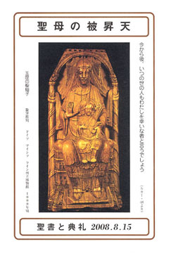 今から後、いつの世の人もわたしを幸いな者と言うでしょう(ルカ1・48より)玉座の聖母子 象牙彫刻 ドイツ マインツ ライン州立博物館 1000年頃幼子キリストを正面に抱えて玉座に着くタイプの、神聖ローマ帝国の初期、オットー朝 (10世紀末~) のマリア像である。5世紀から描かれるようになった初期の聖母像の代表的な型にあたる(下図参照)。他の聖人が玉座に描かれることはなく、マリアには他の聖人とは比べられないほどの尊厳、すなわち、神を生んだ方 (=テオトコス) 、神の母としての聖性において崇敬されていることが如実にうかがわれる。これは、神の子が真に人となったというキリストの神秘に関する信仰理解の問題でもある。神の子を人として生み出したマリアは、自ら神の子の聖性にも深く交わり、その生涯を全うし、いのちは完全に神に受け入れられるものとなった。被昇天の神秘の意味することだろう。 6世紀 ビザンチンの象牙浮き彫り このような全生涯を反映した像が、神的尊厳にあずかる方として、御子とともに玉座に描かれるマリアなのである。聖母賛歌で「天のきさき」「天の元后」としてたたえられるマリアである。この作品のマリアにも素朴ながら明るく高貴な気品と慈愛が深く感じられる。イエスもすでに小さな皇帝のような威厳をたたえている。すでに天におられる主キリスト、そして天に受け入れられたマリアの生涯すべてがこの中に写し出されているといえる。(『聖書と典礼』編集長 石井祥裕)まんが聖書物語