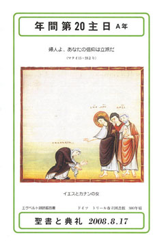 婦人よ、あなたの信仰は立派だ(マタイ15・28より)イエスとカナンの女 エグベルト朗読福音書 ドイツ トリール市立図書館 980年頃このエピソードを描く絵は、エグベルト朗読福音書以外になかなか作例がない。しかし、繰り返し見ても、味わいの尽きない作品になっている。やはり、信仰への問いかけをもって、イエスが人々と出会っていった様子が、人物の姿、姿勢、手の動き、眼差しなどによって細やかに描かれているのである。この作品でも背景の描写は一切省き、イエスとカナンの女との出会いのみを浮かび上がらせていることの効果は鮮やかである。この場面、右側の弟子たちのちょっと顔をしかめた感じは「この女を追い払ってください」との言葉に対応する。それに対するイエスの返事はマタイでは「わたしは、イスラエルの家の失われた羊のところにしか遣わされていない」となっており、続く言葉の中の「子供たち」がユダヤ人、「小犬」が異邦人を指すことから、全体は、イエスが異邦人の信仰を積極的に認め、この出来事をきっかけとして、異邦人への宣教が広がっていくという展開になっている。異邦人の敬虔な信仰を示す女は、ここで実際にはひれ伏してはいないが、身を深く屈める格好にしてあり、その心情は十分に表現されている。それでいて手はイエスのほうに向かっており、「憐れんでください」「お助けください」というイエスに向けた救いの願いが表されている。イエスは、彼女のほうにしっかりと体を向け、すっと差し出した手をもって「あなたの信仰は立派だ」と告げている。二人の心情の変化を絵とともに追想してみたい。(『聖書と典礼』編集長 石井祥裕)まんが聖書物語