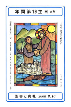 「主よ、助けてください」(マタイ14・30より)湖上のイエスとペトロ 手彩色紙版画 アルベルト・カルペンティール(ドミニコ会 日本)ひときわステンドグラスのようなつくりの作品である。きょうの福音マタイ14・22-33の記述にそって鑑賞してみよう。まず25節の「夜が明けるころ」。この絵ではすでに高く上がり、燦然と輝いている太陽として表されている。「イエスは湖の上を歩いて」。湖面にあるイエスの足がはっきりと描かれている。29-30節が記すペトロの行動。水の上をイエスのほうへ歩いていったが、強い風に気づいて怖くなり沈みかけたということは、ペトロの半身の姿と白い水しぶきで示されている。風が吹いてきてペトロが沈んだのではなく、怖くなったから沈みかけたとある点が面白い。イエスによれば、彼が疑ったからだということになる。すると、この絵の中の全身のイエスと半身のペトロは神に生きる程度の違いを具象化していることになる。この話における湖(=海)が悪霊の支配する領域を象徴しているだけに、この対比は興味深い。とはいえ、この絵の中心は、ペトロの手がしっかりとイエスの両手によって握られているところにある。イエスを仰ぐペトロのまなざしは信頼心に満ちている。世の誘惑に、信仰の迷いに足をとられながらも、イエスにより頼み、引き上げてもらいながら生きていく信者の姿を象徴するものとして味わっていってよいだろう。そこには永遠の命の象徴として、太陽の光が降り注いでいる。(『聖書と典礼』編集長 石井祥裕)聖書物語(旧約編)聖書物語(新約編)