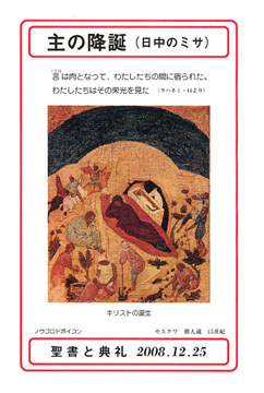 言(ことば)は肉となって、わたしたちの間に宿られた。わたしたちはその栄光を見た(ヨハネ1・14より)キリストの誕生 ノブゴロド派イコン モスクワ 個人蔵 15世紀東方のイコンによる主の降誕図の定型的要素が盛り込まれつつ、独自の要素や画法が含まれるイコンである。西方の作例として12世紀ドイツの象牙浮き彫り(下図)と比較すると、次のものが東西共通の要素であることがわかる。(1) ろばと牛(イザヤ1・3を背景に幼子の姿で生まれた主を知る者、信じる者の象徴となる。牛はユダヤ人、ろばは異邦人とも解される)(2) 出産の疲れの中で横たわるマリア (神の子が確かに人間として生まれたことの強調)(3) 憂いを帯びたヨセフ(処女降誕という出来事の神秘性の強調)(4) 羊飼いの礼拝 (ルカ福音書に基づく降誕の神秘への驚嘆と賛美の象徴) これに対して東方のイコンで固有な定型要素は、(a) 誕生の場所が岩山の洞窟であること(b) 二人の助産婦が幼子イエスの湯浴みをしていること(向かって左下)である。 この2つの要素には多分にイエスがベツレヘムの洞窟で生まれたと伝える伝説的な『ヤコブ原福音書』の影響が大きい。洞窟での誕生は世の闇の中に宿った光である神の子の意味合いで捉えることができよう。助産婦の湯浴みに関しては、マリアの処女降誕を疑った助産婦サロメの右手がなえたという逸話が元の話である。この話は描き方がしだいに変化し、多くは、1人の助産婦が幼子イエスを抱え、もう1人が水を注ぐという構図になっていった。そこにイエスの洗礼が暗示されていたという。 こうした要素を踏まえつつ、表紙に掲げたイコンは、中央から右側に4人の羊飼いが比較的自由に配置され、降誕の神秘を際立たせるとともに、平和で牧歌的な雰囲気さえ示す。降誕によってもたらされた「平和」の表現であるといえよう。さらに(向かって)左上には幼子を探して馬駆ける東方の3人の博士(王の姿)が描かれている。元来、主の降誕は三博士の礼拝、イエスの洗礼までも含む、神の子の顕現の祝いであったことが思い起こされる。上の青い部分は天空の象徴で、見えにくいが降誕を祝う天使たちの一群が描かれている。色調の明るさ、穏やかさはこのイコンの個性である。(『聖書と典礼』編集長 石井祥裕)カトリック平野教会 クリスマス日中のミサ ご説教聖書物語(新約編)