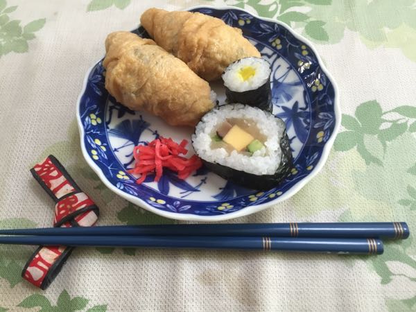 今日の昼食は力餅食堂のおいなりさん、巻き寿司、香々巻でした。