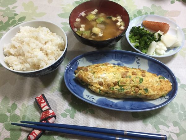 今日の朝食は納豆オムレツ定食でした。 京都・紫竹 牛若の里 中粒納豆