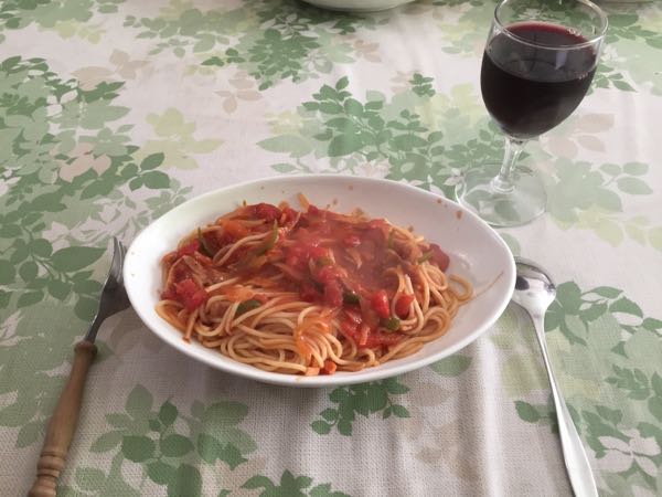 今日の昼食はトマトソースパスタ、赤グラスワイン付です。