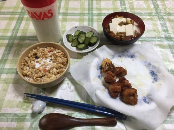 今日の朝食は唐揚げの炭水化物制限定食でした。 ザバス ウェイトダウン ヨーグルト風味 336g >>大豆プロテイン