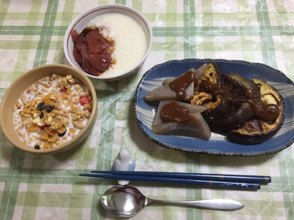 今日の朝食は鮪山かけと茄子の田楽の炭水化物制限定食でした。 京都上賀茂産 賀茂茄子(2Lサイズ、1個)