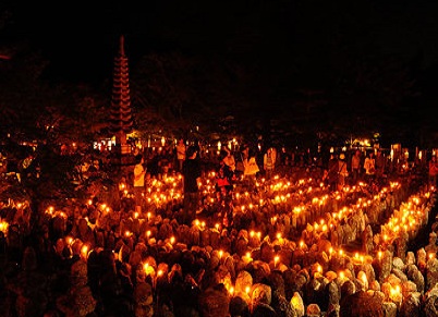 京の鳥辺野(とりべの)・蓮台野(れんだいの)・化野(あだしの)は平安時代の葬送の地でした。それらの土地に放置されたままの無名の遺骸を、弘法大師(空海)が埋葬し、弔ったことがあだし野念仏寺の始まりです。やがてそこらの墓石や石仏を1カ所に集めて、無縁仏を供養するようになりました。千灯供養では石塔や石仏およそ8,000体の無縁仏に無数のロウソクをともして供養します。日程:2016年8月23日(火)・24日(水)17:30~20:30 料金:行事協力維持料1,000円 場所:あだし野念仏寺住所:京都市右京区嵯峨鳥居本化野町17電話番号:075-861-2221拝観時間:9:00~16:30拝観料:500円アクセス:京都バス「鳥居本」下車徒歩約5分HPアドレス:http://www.nenbutsuji.jp/index.html
