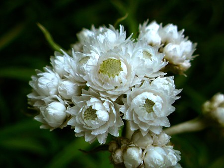 こんにちは。8月28日(日)の京都市北区は雨、気温24度です。皆さん、今日一日おきばりやす。今日の花言葉はヤマハハコで「純情」です。ヤマハハコ(山母子、学名:Anaphalis margaritacea )はキク科ヤマハハコ属の多年草。雌雄異株。特徴茎の高さは30から70cmほどになり、茎には灰白色の綿毛が密生する。葉は無柄で茎に互生し、形は線状披針形。葉の表面はつやのある緑色だが、裏面は茎と同じ灰白色の綿毛が密生する。葉脈は3本あり、縁は全縁でやや裏面に巻き込む。花期は8月から9月で、茎の上部に淡黄色の頭花を散房状につける。白いカサカサした花びら状のものは総苞片。分布と生育環境日本では、北海道、本州(長野県および石川県以北)に、日本国外では、千島、樺太、カムチャツカ、中国、ヒマラヤ、北アメリカに広く分布する。山地の日当たりのよい草原、崩壊地、道路法面などに群生する。