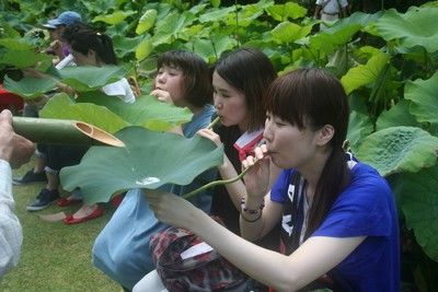 ハスの花が見ごろを迎える時季、本堂前でハス酒を楽しむ会が催されます。先着300名の成人男女が参加でき、参拝者は受け取ったハスの葉にお酒を注いでもらって、茎からお酒を吸い込みます。ハスのほろ苦い味が楽しめるといい、お酒が飲めない人は、透明な酒の玉が葉の上をコロコロと転がる様子を楽しめます。日程:2017年7月14日(金)9:00~12:00(9時より先着300名様限り) 料金:入山料500円、参加料500円 場所:三室戸寺