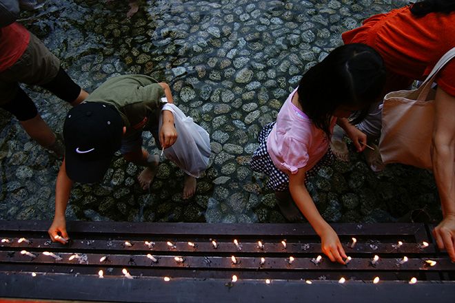 御手洗祭の「足つけ神事」は、火を灯したろうそくを手にして、御手洗池に膝下まで浸かりながらゆっくり進みます。井戸の上に社殿が造られ祀られている末社・井上神社に灯明を供え、そのあと御神水を頂きます。土用の丑の日に御手洗池の中に足を浸すと罪や穢れを祓い、疫病や安産にもご利益があるといわれています。日程:2017年7月22日(土)~30日(日)5:30~22:00 料金:灯明料300円 場所:下鴨神社[賀茂御祖神社]