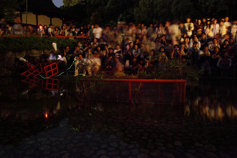 17:00から門前にて奉告祭が斎行され、それに合わせて橋殿・細殿でお茶席が開かれます。神服殿では18:00から十二単の着付けと小袿(こうちぎ)の舞や箏曲の演奏が行われます。橋殿・細殿・神服殿はすべて重要文化財です。20:00になると御手洗池の中央に置かれた大きなホタルかごから約600匹のホタルが放たれ、辺りは蛍火が飛び交う幻想的な空間となります。また、楼門南側に広がる糺の森では納涼市が賑わいを見せています。日程:2019年6月上旬(予定)17:00~ 21:00 料金:2,000円(糺の森財団会費として) 場所:下鴨神社[賀茂御祖神社]