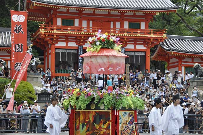 24日夜の還幸祭に先立ち、花傘巡行が行われます。芸能色が濃く、山鉾巡行などとはまた違った趣で祇園祭を楽しむことができます。八坂神社を出発した傘鉾や祇園太鼓に祇園囃子、獅子舞、鷺踊などの巡行列が市内を巡行し、見る人を楽しませてくれます。日程:2019年7月24日(水)10:00~ 料金:無料 場所:石段下→市役所前→八坂神社 電話:075-561-6155(八坂神社)