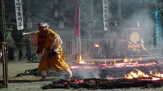 行灯がともされた階段を上り、本殿へと向かいます。数十人の山伏たちが広場で成満柴灯大護摩法要を営み、護摩の残り火の上を素足で渡る火渡り行を行います。その後、参拝者も行に参加でき、山伏の導きがあるため、子供も無事に渡り終えることができます。先着1,000人に火渡りのお札の授与(500円)もあり、無病息災で今夏を過ごせるように願います。日程:2019年7月28日(日)19:00~ 料金:入山料500円 場所:狸谷山不動院