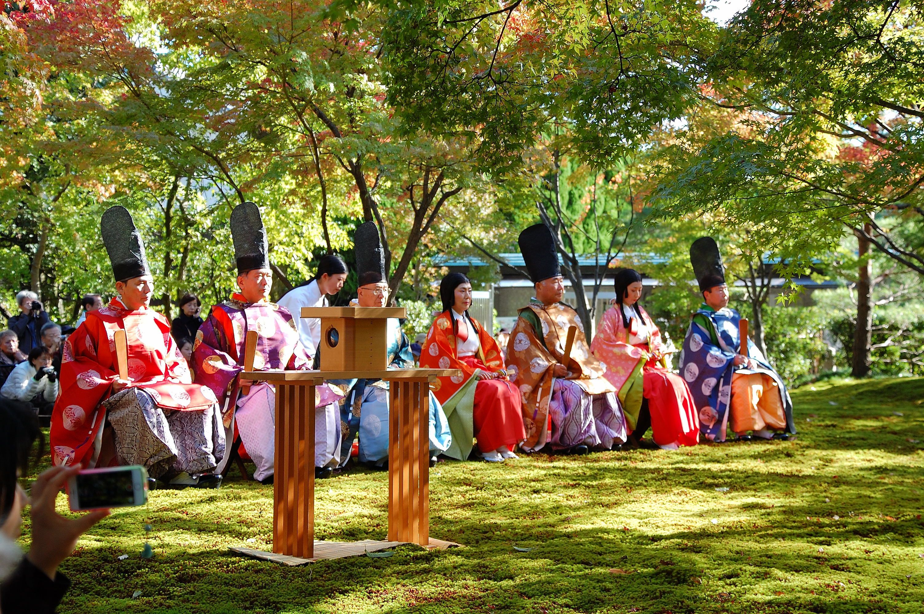 王朝の雅を今に伝える曲水の宴は、城南宮の「神苑 楽水苑 平安の庭」で催されます。平安貴族の風雅な遊びを再現しており、色とりどりの平安装束を身につけた7人の歌人たちが遣水(やりみず)の川辺に座り、おしどりをかたどった羽觴(うしょう)に盃を載せて流し、当日の題にちなんだ和歌を詠んで短冊にしたため、羽觴を取り上げ盃のお神酒を飲み干します。宴の間には白拍子の舞なども披露され、ゆったりとした時の流れる空間をいっそう雅な雰囲気にしています。日程:2019年11月3日(日・祝)14:00~料金:無料場所:城南宮