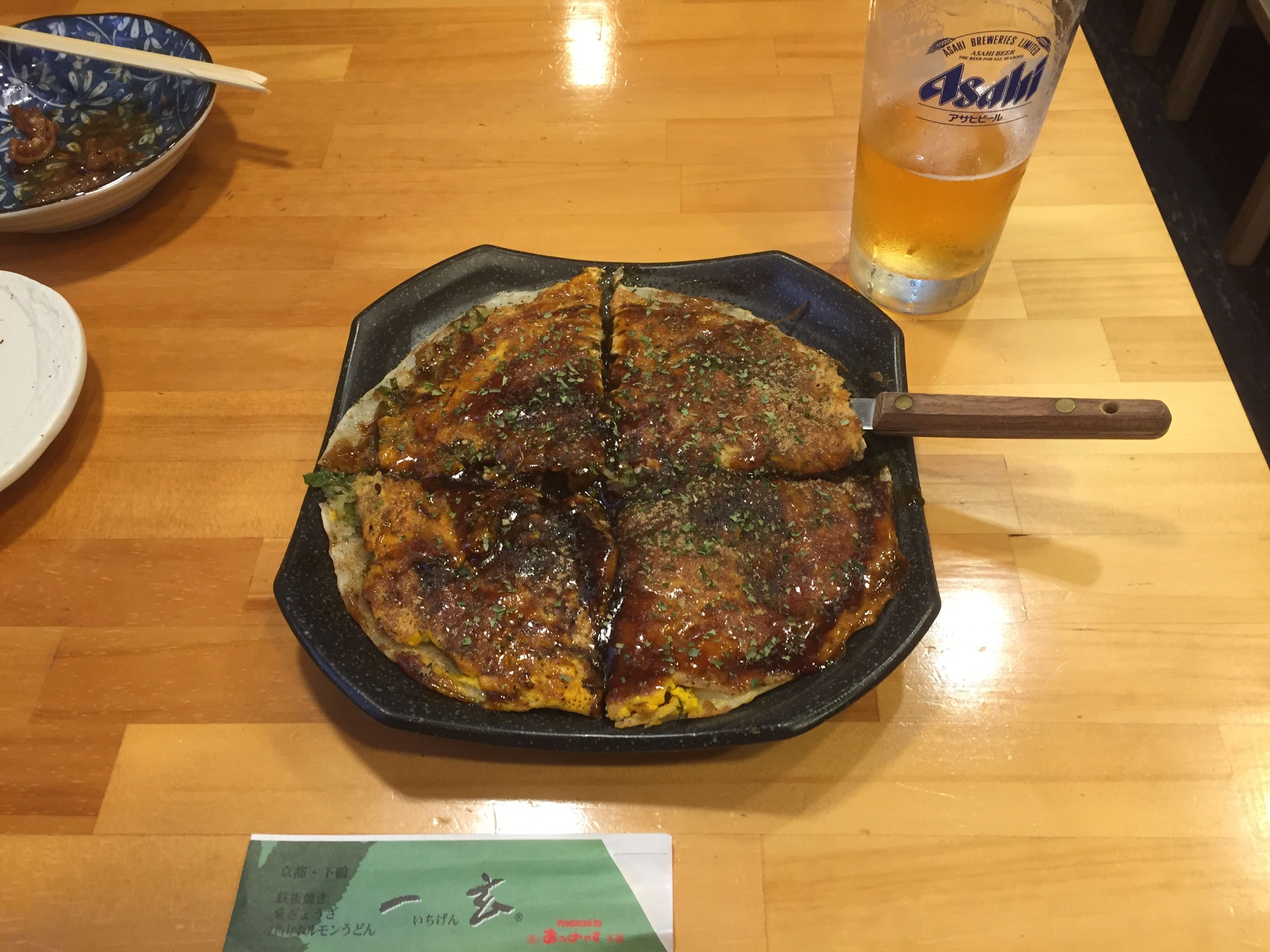 〆は何にしようかと考えたところ、「すじ入りねぎ焼き」に決定、関西風とは少しことなり薄く焼いてありますが生地がもちもちで美味しくいただけました。これもまたビールが進みます。