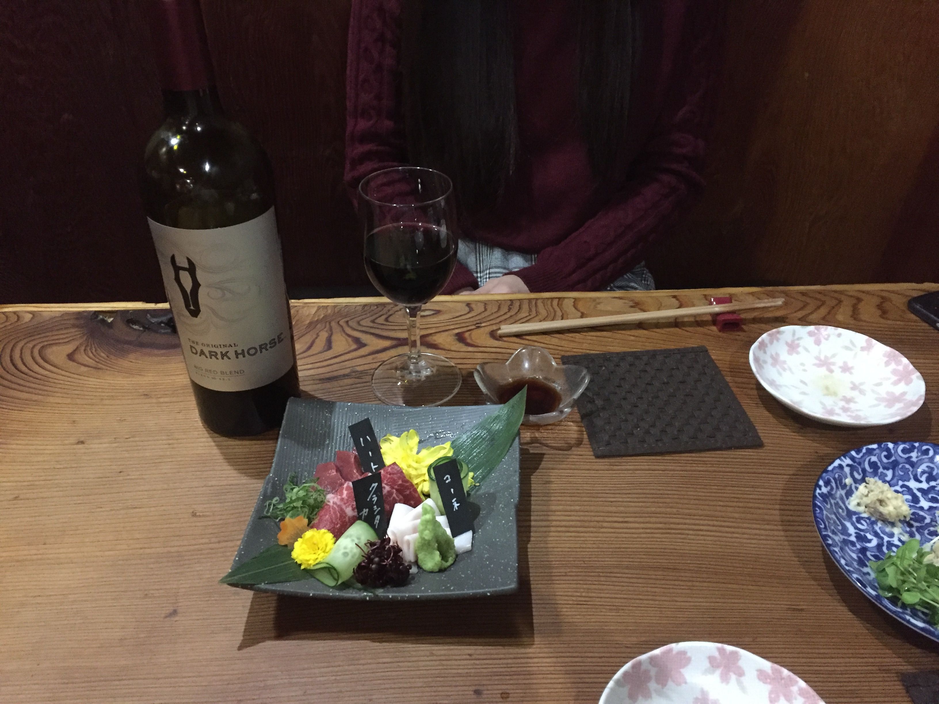 赤ワイン「ダークホース」を追加でお願いすると「馬刺し盛り合わせ」がでてきました。このワインのチョイスは馬肉屋ならではだそうです。フルボディーながら渋みが少なく馬刺しと九州の甘い醤油に良く合います。