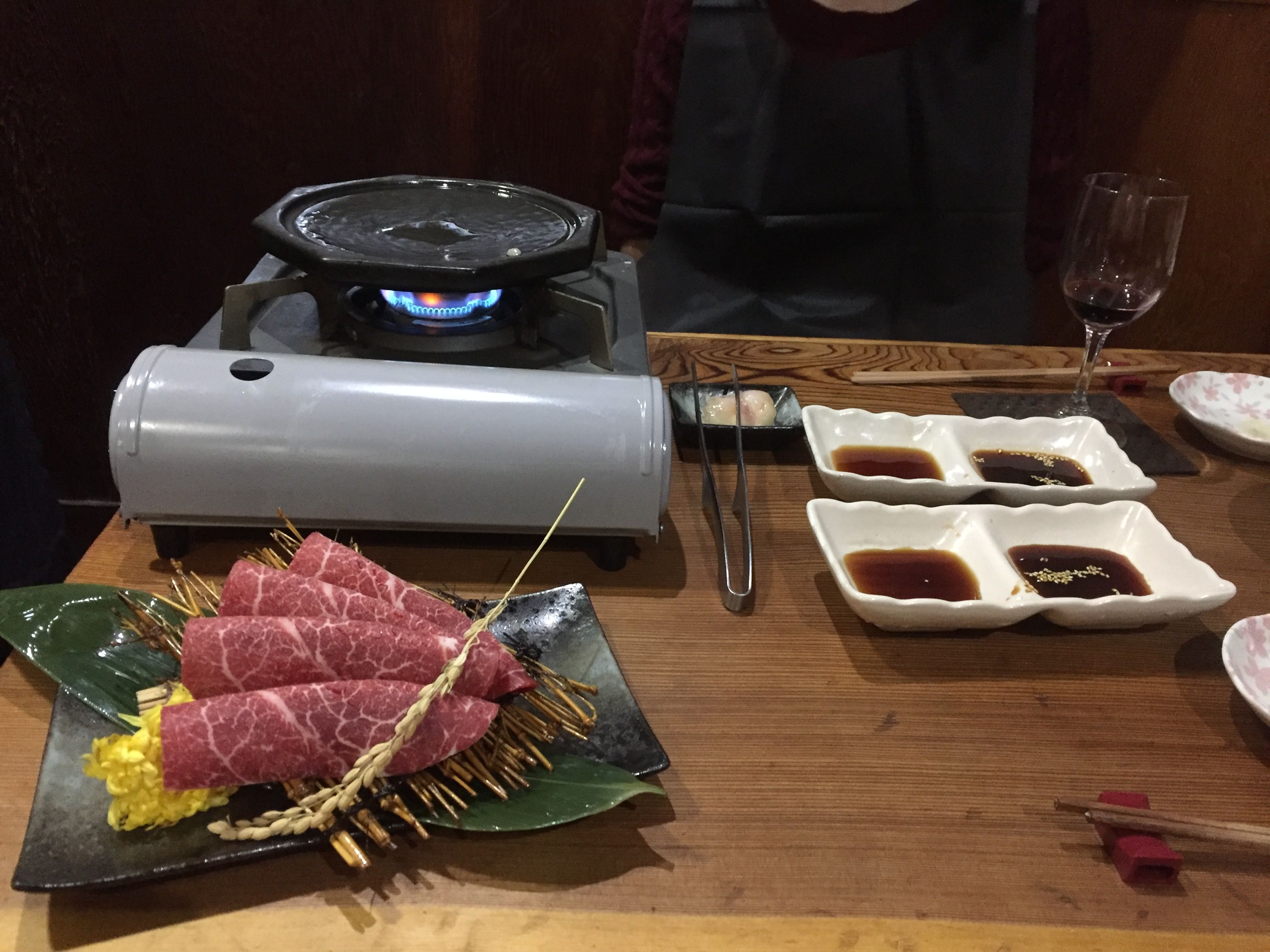 次に当店おすすめの「焼きしゃぶ」を頂きます。陶板に馬脂をたっぷり塗りかるく焼きます。これは絶対にお薦めです。赤ワインがすすみます。