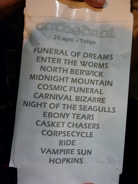 ゲットした人に写真撮らせてもらいました。RIDEで終わって、アンコール2回。カテドラルを観るのはこれが最後なんだと思うとHOPKINSのときは、涙でてしまいました。最高のライブでした一生忘れないと思います。