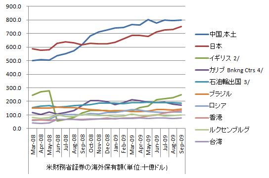 米財務省が11月17日に発表した9月の対米証券投資統計によれば、海外政府および海外投資家の中長期の米国債は447億ドルで8月よりも増加したらしい。経常黒字国から経常赤字国・米国への資金の還流に大きな変化は見られない。ただ、財務省短期証券(TB)や株式スワップ等の短期金融資産への流入額が大きく、資金の足が速い。年末を超えるまでは金融市場の乱高下が予想される。 9月対米中長期証券投資:買越額407億ドル、機関債売り越し(Update1) (2009/11/18 00:20 JST ブルームバーグ) 米財務省証券海外保有額をグラフ化すると下図のようになる。 日本・英国の伸びが大きく、中国が横ばい。中国は元高ドル安が進むと考えて、ドル資産を買増しを控えている。これに対し、日本は、円安ドル高、英国はポンド安ドル高が進むと見てドル資産の買増しに走っている感じである。長期保有方針なら妥当なところと考えている。 今後、貿易決済に使用されるドル、円、ポンドの割合は縮小するから外貨準備に占めるドル、円、ポンドの割合は縮小せざるを得ない。これら通貨の相対的な減価はさけられないと見ている。 何の根拠もないが個人的には、10年後、貿易決済に使用される通貨割合をドルで40%前後、ユーロで45%前後、その他で15%と考えている。中国のGDP成長率から、将来、元は必ず基軸通貨になり、逆に、円は基軸通貨から脱落し、地域通貨となるだろうと予想される。 まあ、円の価値が下がり、日本経済が中国経済に追い付くには100年はかかると言われる状態になれば、今の経済問題の大半は解決すると見られるのだが、そこまでの経済縮小に日本社会が耐えられるかが問題。耐えるには無理だろうなぁ~。 日本国債は貯蓄率の減少速度および名目GDPの伸び率から10年以内に国内で消化できなくなる。いつかハイパーインフレを起こさせないと国債のデフォルトは避けられなくなる。こんな状態の円が現状の価値を維持し続けることは非常に困難。延命措置で増税や財政支出削減をいくら実施しようとも、ないものはを集めることはできないし、ないものは払えないのだから結果は同じである。 考えられる打開策は、名目GDPを大幅に増加させるか、国民が現状消費を削り生活水準を大幅に落とすかしか方法がない。名目GDPの大幅増加は不可能なのだから、政府は国民に生活水準の大幅低下を受け入れさせなければならないとみている。参照資料 2009年09月対米証券投資統計[財務省] 経済と株式経済ニュース株取引