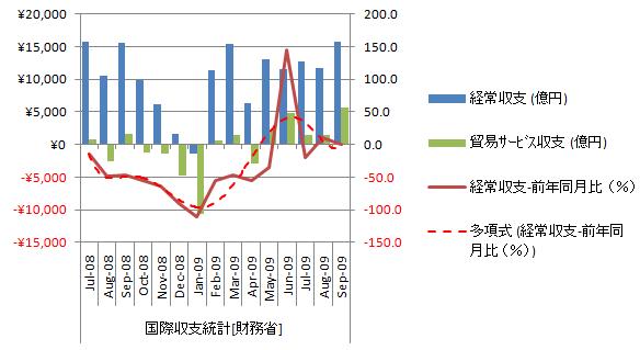 経常収支は、大きく改善した様に見えるが、季節要因が大きい。前年同月比の推移に近似線をいれると、堅調な回復とは言い難い。やはり、経常収支は1兆円前半、貿易・サービス収支は5000億円で安定しそうだと見ている。外貨準備高の伸びがキツイ、ドル安でドルベースでの評価額が膨らんだと言うことらしい。経常黒字、4~9月9.7%減 減少率縮小、貿易収支は黒字転換(2009年10月10日 11:07 日経ネット) 経常収支をグラフ化すると下図のようになる。 経常収支は1兆5000億円を超え、増加基調。直近も増加。大きく増加していているのは季節要因。正味の増加は、貿易収支の増加の影響。対前年同月比は上昇基調で推移し、直近も減少。前年同月比の近似線の動きを見てみると、年末に向かって経常収支が順調に増加するとは思えない。経常収支は今後1兆前半で安定すると考えている。 貿易・サービス収支はプラス圏で推移し、増加基調。直近も増加。コンテナ船の稼働率から欧米の輸出はちょっと期待薄。ただ、心配していたマイナス圏への沈み込みはなさそうである。こちらは、5000億円程度で安定しそうだと考えている。経常収支の長期推移をグラフ化すると下図のようになる。 経常収支に12か月移動平均を入れてみると、2000年前半水準の2/3程度で安定し始めていることが分かる。欧米先進国がリーマンショック前の消費性向に復帰することは当面考えられず。また、中国を初めてとする新興国需要が欧米先進国の喪失した需要を埋めるとは考え難い。第一、中国は政策目標であったGDP8%を達成している。中国がこれ以上の成長を目指せば、制御不能のバブルを発生させてしまう。よって、日本の経常収支は、しばらく、1兆円前半で安定し推移すると考えている。 貿易・サービス収支の長期推移をグラフ化すると下図のようになる。 貿易・サービス収支に12か月移動平均を入れて見ると増加基調で、現状は0近傍付近。経常収支と同様こちらも経常収支と同様の理由で、早晩安定するのではないかとみている。 外貨準備高の推移をグラフ化すると下図のようになる。 経常収支の水準が切り下がっているのに、外貨準備の増加速度に陰りが見えない。これは、国内のドル需要が縮小している為と考えられる。日本の国際貿易額の大きさから考え、これ以上の外貨準備額の増加は為替相場安定に寄与するとは考えられない。、 ついでに直接投資の推移をグラフ化すると下図のようになる。 海外への投資水準も切り上がっているのだが、3000億円位は、足りなさそう。為替相場は不安定な相場が続きそうである。参照資料 平成21年8月中 国際収支状況(速報)[財務省] 経済と株式経済ニュース株取引