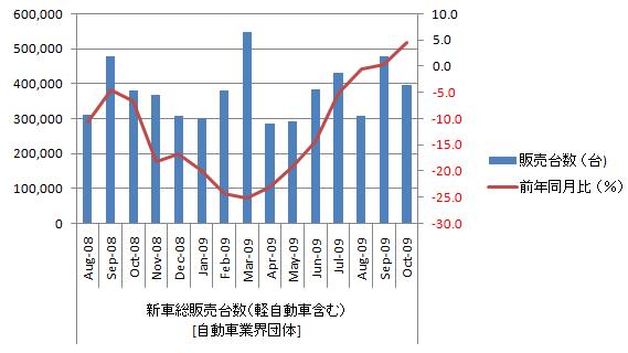 月の新車総販売台数(軽自動車含む)は、前年同月比4.4%増で絶好調。内訳は登録車が12.6%、軽自動車がマイナス8.9%。エコカー減税や購入補助金制度は、需要が登録車に偏らせてしまっているが全体を良く押し上げている。年末まで前年同月比が4.4%で推移したとしても年間販売台数の前年比はマイナス11.4%。先月時点の見通しと変わらず2009年の販売台数は前年比-10%前後の減少とみる。政府が支援策が切れてからが国内市場の正念場となりそうである。 10月の新車販売、12.6%増 ハイブリッド車が好調(2009年 11月 2日 日経ネット) 新車販売台数(軽自動車含む)をクラフ化してみると下図のようになる。 新車販売台数(軽自動車含む)は季節変動が大きい為、対前年前月比に注目すると10月の伸び幅は回復。前年の販売台数の落ち込みを考えると前年同月比がマイナス圏に沈むことはなさそうである。 年初から今年8月までの累計販売台数は380.0万台、月平均販売台数38.9万台、前年同期比で-12.7%減。月平均台数を年換算すると466.5万台。前年同期比の年換算は438.2万台となる。ちなみに昨年の年間販売台数は508.2万台である。やはり、2009年販売は前年比でマイナス15~マイナス10%、455万台~485万台位に収まりそうである。前年比がこの範囲に収まるならメーカ間で業績に大きな差がでそうである。 国内自動車販売市場の先行きを見るために長期推移をグラフ化すると下図のようになる。 2004年4月から2009年10月の一時回帰直線はy=-1671.7x+503000となる。月当たり1672台の減少、年率換算で2.0万台減少。前月から幾分、改善しているが、国内自動車市場の長期縮小傾向はかわらない。 国内市場は長期縮小傾向で、人口動向を考えると拡大に転じる可能性はない。自動車メーカは国外でどれだけ売るかで勝負が決まることになる。トヨタ・ホンダ・日産以外のメーカは先行きが暗そうに見える。個人的には、日産もかなり危険そうにみえる。 参照資料 日本自動車販売協会連合会 全国軽自動車協会連合会