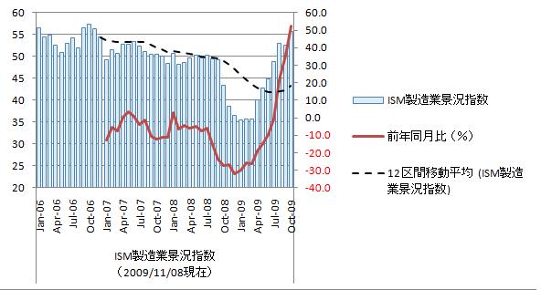 ISM景気指数は、米国経済の景気底入れを示し、景気回復のエンジン役は製造業であることを示している。問題は米国産業の中心は第3次産業でGDPの約8割を占めることである。ISM非製造業景気指数はISM製造業指数の回復ぶりに比べると、かなり見劣りがする。厄介なことに、ISM製造景気指数の受注が下降気味で先行きが不安。非製造業指数に至っては、下降してしまっている。ちょっと先行き不安が増してきた。 米ISM製造業景気指数をグラフ化すると下図のようになる。 製造業景気指数は好不況の分かれ目となる50を超え、直近3カ月連続の上昇で55.7。絶好調!!。急回復は、ISM景気指数の詳細を見れと在庫積増効果による生産増と新興国需要による輸出増効果。 ただ、個人消費の伸びが限定的な現状では、早晩、在庫積増が一段落すると考えられ、このままいけるとはちょっと考えられない。既に新規受注に陰りが見え始めている。来月の状況を見ないと何とも言えないが年末にかけて下降に転じる可能性がある。 米ISM非製造業景気指数をグラフ化すると下図のようになる。 非製造業景気指数は好不況の分かれ目となる50を辛うじて維持。直近は下降で50.6。米国産業のエンジンであるべきはずなのに調子が上がらない。下降したのは、ISM景気指数の詳細を見ると、雇用と輸入の落ち込みが原因。輸入が不調であることから個人消費の弱さ、また、雇用状況の改善が遅れている様子が伺われる。 両景気指数とも価格指数の伸びが強いのは、資源価格高騰の影響と見られる。あまり良い状況とは言えない。 失業率の10%を超えは、米国政府に失業対策を督促しているが、雇用状況を改善できそうな産業は、現状、製造業しかない。国内需要は期待できないのだから、輸出を伸ばすしか雇用を改善する方法はなく、ドル安を容認せざるを得ない。 また、国内需要は伸びないのだから、国内製造業に需要を回すには、輸入を制限するしか手がない。保護貿易政策を実施せざるを得ないようである。中国との貿易戦争が予想される。 米国が中国からの輸入に制限をかけるとなると、中国を生産拠点に使っている日本企業の業績にも大きな影響が出ることになる。これ以上、中国‐米国間で貿易紛争が増えるとやっと底入れした日本の景気にも水を差すことになりかねない。なんとかならないものなのだろうか。参照資料 ISM製造景況感指数ニュースリリース ISM非製造景況感指数ニュースリリース経済と株式経済ニュース株取引