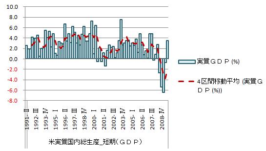 米実質GDPは驚きの3.5%。米国経済の底力と言うべきなのか、それとも景気対策による底上効果と言うべきなのだろうか。なかなか判断が難しい。早ければ第3四半期にもプラス圏に回復しそうとは見ていたが3.5%は出来すぎ。米国の潜在性成長率は、2%前後に落ち込んでいると見ていたのでどんなに良くても3%位だろう思っていたのだが・・・・・。「腐っても鯛」ってことなのだろう。7~9月の米実質GDP速報値、3.5%成長 5四半期ぶり上昇(2009年10月30日 日経ネット) 実質GDP(年率換算)グラフ化してみるると下図のようになる。 第3四半期も大幅な改善。3%を維持してくれれば言うことないんだけどなぁ~~。 米商務省のニュースリリースからは、第3四半期の成長は、個人消費支出と住宅投資の改善の影響。個人消費支出は自動車買い替え支援、住宅投資は住宅購入支援の影響。自律回復力は依然弱く、経済成長エンジンとなりそうな産業が米国企業決算を見る限り見当たらない。グリーンニューディールは、やはり力不足と言うことだろうか。 長期推移をグラフ化して見ると下図のようになる。 一次回帰直線を取るとy=-0.0092x+4.4659。米国の実質GDPは長期下降基調。無理なく実現できそうな実質GDPは現状で2.1%程度となる。今回の改善は、政府の景気対策で、ちょっと行き過ぎた様に見える。米国の財政を考えると現状レベルの景気対策を維持することはできないのだから、この状態での高成長率は、産業構造の歪みを助長し、今後に禍根を残しそう。成長ペースは少し抑えた方が良さそうな状況だと思っている。 今後は、個人負債の削減が進んでいかないと個人消費の自立的な回復は見込めない。個人負債が減るには、不動産等の資産価格の上昇と雇用状況の改善が必須。住宅市場の流動性は上昇傾向で、下げ止まりが見えてきた。後は、雇用環境の悪化が底入れすれば、GDPの本格的な回復が見込める。ただ、雇用環境が悪化が底入れするのはちょっとかかりそうで、それまでは、GDPは1%前半で、足踏み状態になるのではないかと考えている。参考資料ニュースリリース[米商務省経済分析局] 経済と株式経済ニュース株取引