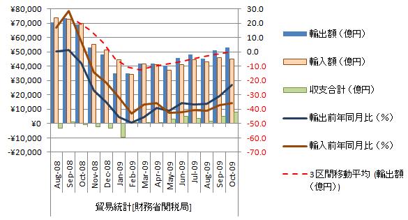 思っていたより良好な内容。輸出額は前年同月比23.2%減の5兆3089億円で予想以上の増加。輸出は順調に改善してきているようである。今年9月より企業の想定為替レートを上回り円高が進んでいるのに輸出額が減らないのは頂けない。輸出数量がかなり伸びていると言うことだがはたして採算ベースになっているかちょっと不安な状況である。10月の輸出23%減、黒字は金融危機後最大 貿易統計(2009年11月22日 日経ネット) 貿易統計をグラフ化すると下図のようになる。 輸出は増加基調、直近は増加。輸出の対前年同月比はマイナス圏で推移し上昇基調、直近2ヵ月は上昇。輸出の回復は快調に上昇している。 輸入は増加基調、直近は減少。輸入の対前年同月比もマイナス圏で推移し上昇基調、直近2ヵ月は上昇。輸入の回復は非常に緩慢である。 収支は9か月連続の黒字、直近は増加。 外需は金融危機後の減少率に対して緩慢ではあるが戻って来ていることは確かなようであるが、危機前の水準まで戻るには相当な時間がかかりそうである。気がかりなのは、円高が進んで輸入がほぼ横ばいで推移しているのに、輸出が伸びていることである。為替変動に輸出が反応していないことを考えると輸出企業がダンピング価格で無理な輸出を行っている可能性を否定できない。年度末決算の影響が危惧される。 貿易統計の長期推移をグラフ化すると下図のようになる。 輸出と輸入共に回復基調なのだが収支の改善が遅れている。輸出額は2004年水準まで戻しているが輸入額は2005年の水準、金融危機後最大の黒字とと言うがグラフを見てわかる通り、金融危機前に比べると見劣りする。輸入額から考えると、あと5000億程度輸出が増加していてもおかしいはない。輸出企業の収益構造が金融危機前後で大きく変化してしまい。貿易収支の黒字が出に難くなっていると考えられる。 国地域別の輸出額をグラフ化すると下図の様になる 米国・中国・EU向け全て軽快に復帰。全体的にも回復基調が鮮明である。ただ、個人的には、そろそろどこも頭打ちになってきていると考えている。中国・アジマ向け輸出はこの辺までで限界と見ている。米国・EUはもう少し伸びるかもしれない。 それにしても、円高ドル安がちょっとひどい。近年は貿易黒字増大が強い円需要を引き起こすことがなくなり、実需から円高を引き起こし難い構造が出来上がっている。それなのにこれである。参照資料 平成21年10月分貿易統計(速報)[財務省]経済と株式経済ニュース株取引