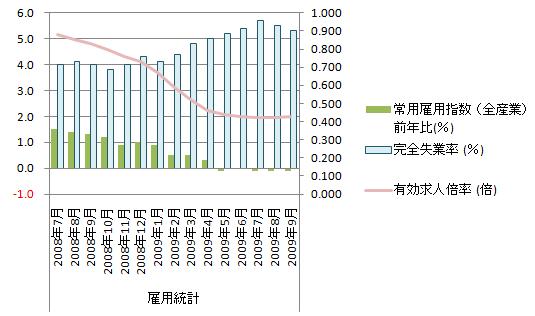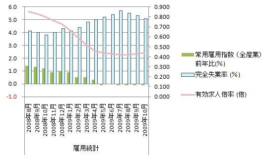 失業率は下降基調に転じ、求人倍率も底入れしたたようである。消費者物価指数の下降幅は大きな需給ギャップ(需要不足・供給過剰)が存在していることを示しており、企業が未だ余剰人員・余剰設備を抱えたまま失業率・求人率が改善したことを意味する。好ましい状況とは考えられない。 「民主社会主義」色の強いの政権運営から企業が雇用調整を躊躇している様子が窺われる。急激な景気縮小の反動からくる景気拡大で企業業績は一息ついているが、問題の本質である需給ギャップは解消しておらず、問題の先送りにより今後、景気は長期低迷することが予想される。 就業者数は対前年同月で117万人減の6271万人。完全失業者数は89万人増の344万人。労働力人口は35万減の6038万。労働人口減少数を上回る就業者数減少が止まらないことから失業の長期化で就職を諦める人の増加が、完全失業者数を減少させたものと考えられる。 失業率・求人倍率は改善基調ではあるが、雇用状況の悪化はだらだらと継続している。現政権下では、大規模な解雇伴う生産資源の再構築は抑制されると考えられる。よって、今後も労働市場の需給のアンマッチは解消されず、また、有望産業への労働力移動も阻害されると思われる。現政権が推し進める政策で日本経済が成長軌道に戻るとはちょっと思えない。UPDATE2: 10月完全失業率5.1%で3カ月連続の改善、厳しい雇用情勢は継続(2009年 11月 27日 13:28 JST ロイター) 失業率をグラフ化すると下図のようになる。 失業率は下降局面、直近3カ月連続の下降。有効求人率は0.4前半で緩やかな上昇基調。就職を諦めた人の増加で統計上は改善に向かっているように見えているが状況は依然悪化傾向。企業は余剰人員を抱えたまま景気回復待ちを続けており、当面、新規労働需要が創出されることはなさそうである。政府の「雇用調整助成金」を貰い当座を凌ぐ方針で、賃金は下がらざるをえない。内需拡大は絶望的である。 個人的な意見では、民主党が選挙公約(マニュフェスト)として掲げた政策の8割程度を放棄して、現実路線に戻すなら激しい雇用縮小を伴うものの早期に労働市場の調整が終了するのではないかと考えている。このまま、だらだらとした労働市場の調整が続くと労働力の質的劣化が進み取り返しのつかないことになりかねないと思うのだがどうだろう。 民主党政権の政策について考えてみると、選挙により政党が掲げる政策を国民が選択したのであるから、選択した政策を実施し、発生する不利益は国民が負担するのが当たり前、政党にその責任を問うことは不当であり公平性に欠けると思われる。政党が選挙により国民より付託されたのは選挙公約(マニュフェスト)として掲げた政策の実施で、実施した結果が失敗であったとしても、その責任は国民が甘んじて受けなければならないと考えるからである。人によっては長期失業によって生命の危機に直面させられることになるが仕方がないと言うことになる。なかなか、厳しい世の中になったものである。参照資料 労働力調査(基本集計) 平成21年10月分(速報)結果[総務省統計局] 経済と株式経済ニュース株取引