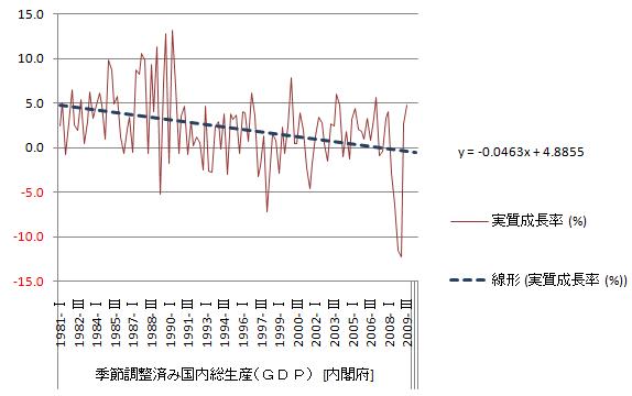 実質GDP成長率は1.2%、年率換算で4.8%。予想以上にいい。内需が0.8%、外需が0,4%、「エコポイント」と「エコカー減税」により押し上げられた個人消費と新興国需要に支えられた外需の影響。設備投資も久しぶりにブラス転換。明らかに、国内外の景気対策頼みの成長で自律的な景気回復とは言い難い。 7~9月期実質GDP、年率4.8%成長 設備投資増加に転じる(2009年 11月 16日 日経ネット) GDP実質成長率(年換算)をグラフ化すると下図のようになる。 一次回帰直線のかい離率をからは今回の値は変動幅の上限値。急激な落ち込みの揺り戻しと考えられる。 日銀によれば潜在成長率は0.5%、今回の実質GDP成長率は潜在成長率を大きく上回る。継続できる水準には見えない。物価は長期デフレ傾向でデフレスパイラルがいつ起きても可笑しくない状況だと考えている。名目GDPがデフレの影響を強く受けマイナス0.1。ちょっと、厳しい。 次に実質GDP(季節調整)の推移をグラフ化すると下図のようになる。 実質GDP成長率の一次回帰直線がx軸に交わりマイナス圏に沈んだことから、実質GDPは2008年第1四半期を頂点に減少していくと見ている。現状の経済政策に変化がないとすれば、日本は、人口減少と技術進捗低下の為、実質GDPが長期縮小傾向となると考えられる。 移民の受け入れでもしなければ、日本の経済的は持たないと考えている。今、日本国内にいる人材では、日本経済を立て直すことは不可能だろう。 内閣府が13日発表した10月の消費者態度指数は40.5、前月と同水準。局面が転換し始めている。今後も消費が増加するとは思えない。 また、景気動向指数から景気の底は今年3月。景気の底から上昇が終わるまでの月数の今までの最短が13カ月。今回の景気拡大は、雇用統計をみる限り、『雇用なき景気回復』。景気回復は、短期で終了する可能性が高い。継続期間を13カ月と考えると来年3月でピークアウトする。株価のピークを迎えるのは、来年2月中と考えられる。 現在、日本株は、冴えないがピークアウトしているとはちょっと思えない。12月から来年1月にかけて上昇基調に復帰すると見ている。参照資料 四半期別GDP速報[内閣府] 経済と株式経済ニュース株取引